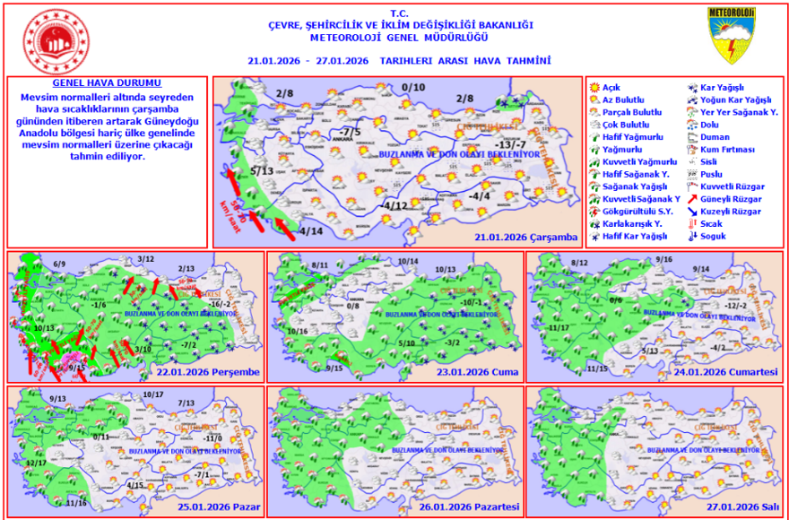 Gece ve sabah saatlerinde Marmara’nın doğusu ile iç ve doğu bölgelerde buzlanma ve don olayı ile birlikte pus ve yer yer sis bekleniyor. Doğu Karadeniz’in iç bölümlerinin yüksekleri ile Doğu Anadolu’nun doğusunda yüksek kar örtüsüne sahip eğimli kesitlerinde çığ tehlikesi bulunmaktadır.